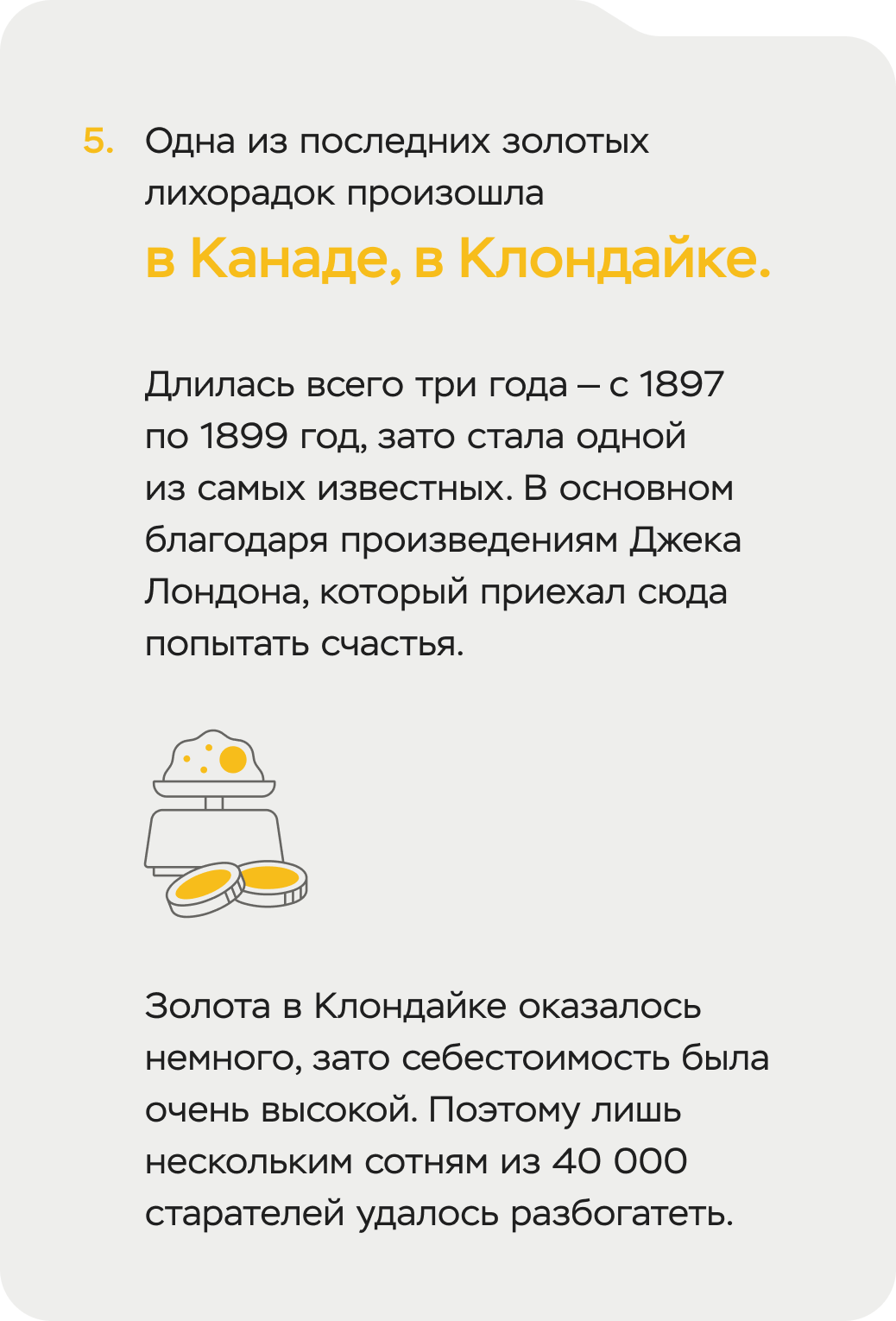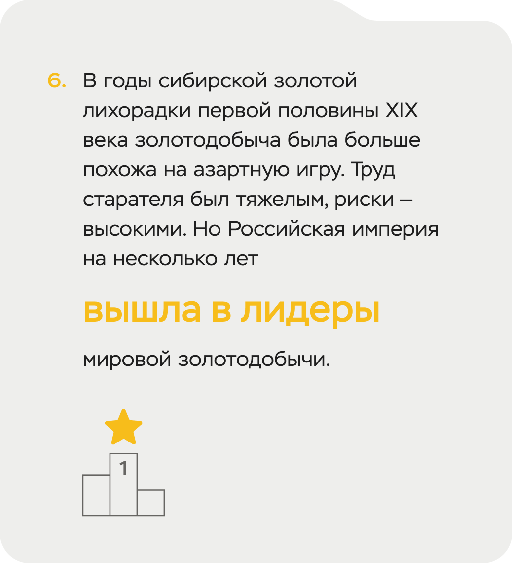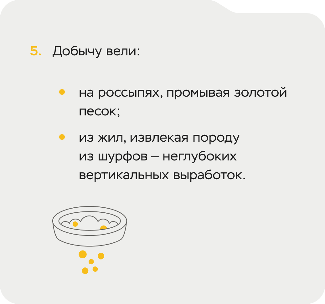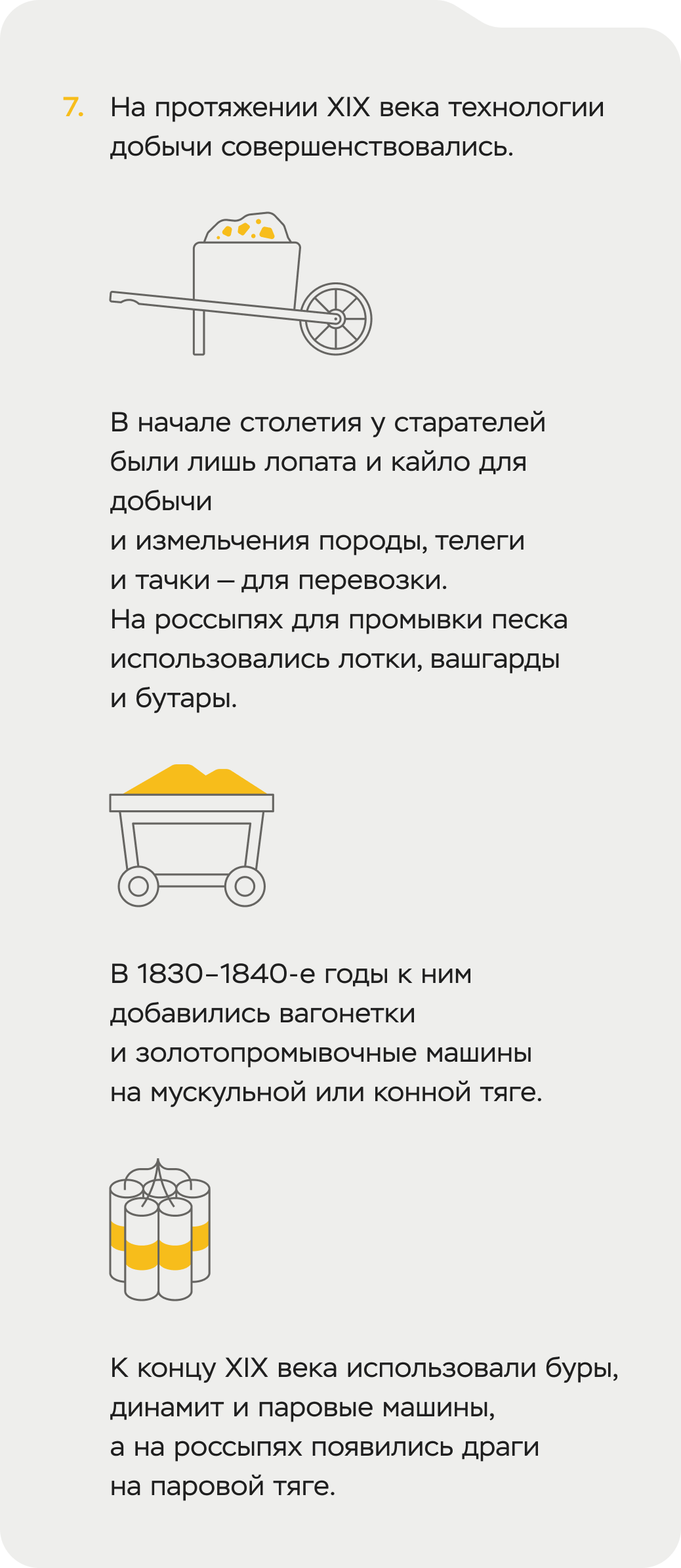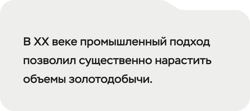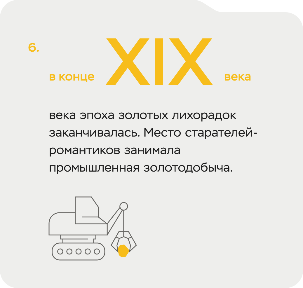 Вы сможете проследить за развитием золотодобычи — от первых старателей и эпохи золотых лихорадок до современных промышленных производств